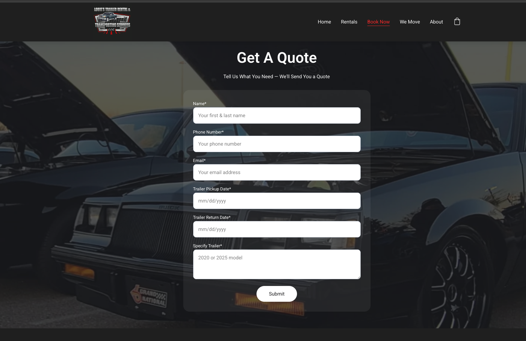 Description: For Louie’s Trailer Rentals, I designed a visually engaging website that highlights each trailer’s load-specific specs in a clear and professional layout. The site features eye-catching visuals throughout, including a standout background in the contact form section (as seen in the screenshot), making it easy for visitors to get in touch and request more information.