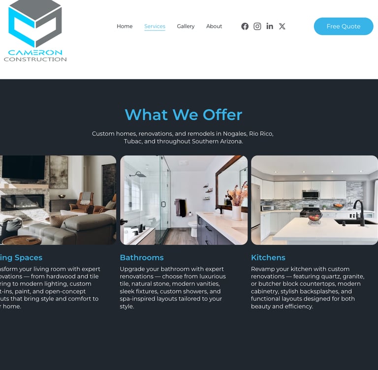 Description: We created a modern, professional website for Cameron Construction LLC, highlighting their full range of contracting services. Designed to showcase their Southern Arizona focus while supporting clients statewide, it legitimizes their brand and attracts new customers with attention to detail.